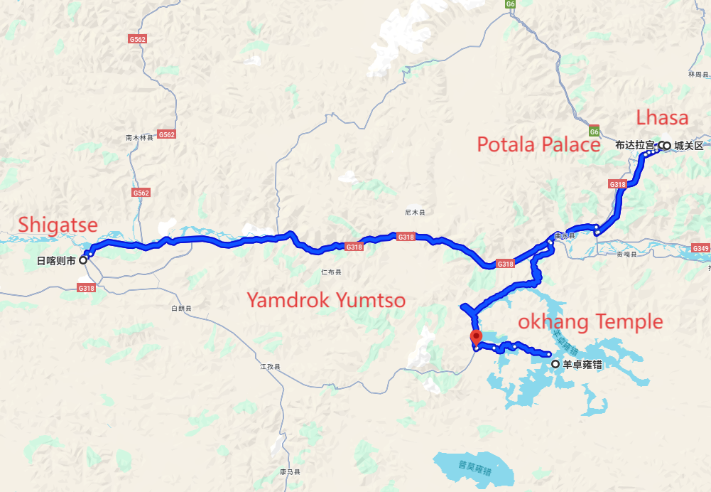 Lhasa-Shigatse tour:Hotel breakfast included.Visit Yamdrok Yumtso,Ganbala Mountain,Karola Glacier,Manla Reservoir via transport.3 hotels;meals self-arranged.