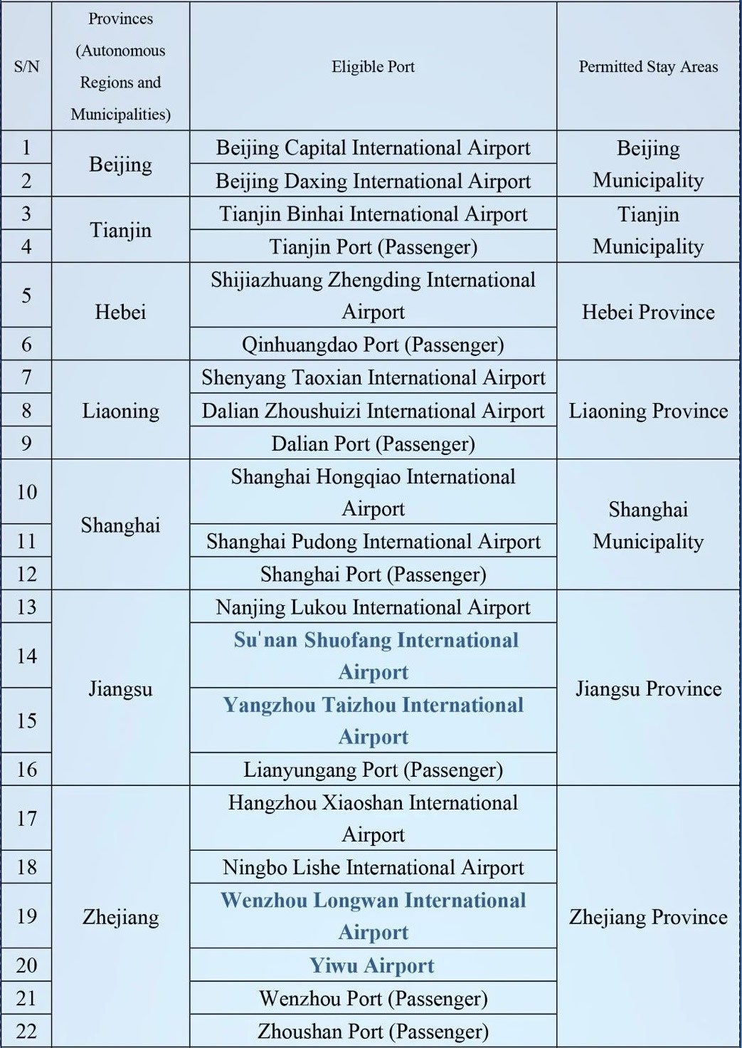 All open exit-entry ports in China implement this policy for nationals of all other countries around the world. Foreigners transiting through China to third countries or regions may stay in China for no more than 24 hours without a visa, provided that they hold valid international travel documents and onward international flight/ship/train tickets with confirmed seats, and will not leave the restricted areas of ports. For any foreigner who does need to leave the designated restricted area, a temporary entry permit must be obtained first at the immigration inspection authority of the port concerned.